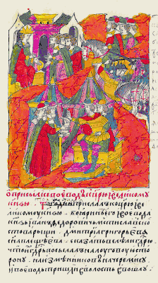 ![]() Лицевой летописный свод: «Той же зимой прислал к царю и великому князю боярин его и воевода князь Иван Федорович Мстиславский с товарищами Дмитрия Григорьева, сына Плещеева: сказать велели государю, что государь посылал их на Луговую сторону на изменников на черемису, и воеводы пришли в волость в Ошлу» | |