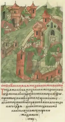 «Того же августа в 7 день послал князь великий боярина своего и воеводу князя Михаила Даниловича Сченятева, да князя Ивана Михайловича Воротынского, и иных своих воевод, да князей и бояр смоленских со многими людьми ко Мстиславлю на князя Михаила Мстиславльского. И князь Михайло, послышав великаго князя воевод, да их встретил и бил челом, чтобы государь князь великий пожаловал, взял его к себе в службу и с вотчиною, да и крест воеводам на том целовал со всеми своими людьми, и к великому князю с воеводами поехал. И великий князь государь пожаловал князя Михаила, к себе в службу и с его вотчиною принял, и жаловал его портисчи и деньгами и его бояр и детей боярских, и в вотчину его ко Мстиславлю отпустил».