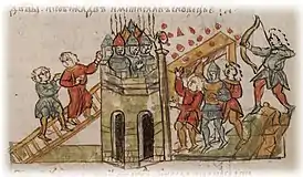 В 1099 году в Великую субботу (9 апреля), подчинившись требованиям Городецкого съезда (1098), Святополк занял Владимир-Волынский и оставил в нём княжить своего сына Мстислава. В этом же году Давыд Игоревич осадил Владимир. Во время осады Мстислав был убит стрелой на городской стене. Считается, что в записи о смерти Мстислава впервые упоминается устроенное на городской стене забороло: «Мстиславу же хотящу стрелити, внезапу ударен бысть под пазуху стрелою на заборолех сквозь дску скажнею».