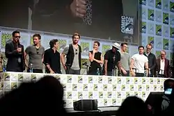 Слева направо: Чёрная вдова (Скарлетт Йоханссон), Тор (Крис Хемсворт), Капитан Америка (Крис Эванс), Соколиный глаз (Джереми Реннер), Железный человек (Роберт Дауни-младший) и Халк (Марк Руффало).