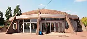 Это наземная односводчатая станция, своды которой напоминает вытянутую баню. Держится на двух рядах опор, в верхней части забетонирована, в нижней части между опорами оставлены стеклянные перегородки с сиденьями.