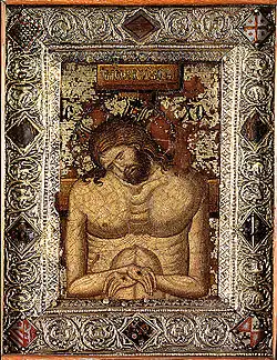 Даниэль Арасс в своей книге «Деталь в живописи»[3] указывает, что этот образ мог использоваться как вариант изображения Arma Christi: Христос, мертвый, стоящий, обычно по пояс, с отчетливо зримыми ранами, в окружении многочисленных Орудий Страстей. В изображениях этого типа существует множество расхождений. «Данный тип изображения устанавливается незадолго до XV века и имеет двоякое происхождение. Икона, привезенная в Рим с Востока (ок. 1300, мозаичная икона, Санта-Кроче-ин-Джерусалемме), породила легенду, призванную утвердить её славу как чудотворной, а легенда в свою очередь породила изображение, связанное с ней. (…) Тип изображения мёртвого Христа в окружении деталей, символизирующих Страсти, сам становится деталью уже более важного повествовательного сюжета, а именно эпизода из мессы св. Григория, во время которой, по преданию, Христос, окруженный символами страстей, явился в видении папе римскому, совершавшему богослужения. (…) Распространение легенды и связанного с ней живописного изображения (полного или фрагментарного) с самого начала поощрялось Римской церковью в связи с тем, что явление живого-мертвого Христа св. Григорию мистически подтверждало реальность пресуществления в таинстве святой мессы. Именем Рима такой образ на много лет обеспечивал отпущение грехов тому из верующих, кто будет созерцать его с соответствующим благоговением». В дальнейшем тип изображения сойдет на нет, и сменится «Пьетой», иконография которого разовьется из этого корня.