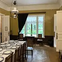 В столовой стоит большой стол из орехового дерева, сервированный на 12 персон. Здесь семья Толстых привыкла собираться по выходным: ужин всегда проходил в шесть вечера, а во главе стола сидела Софья Толстая и разливала всем суп. Тут же висят старинные швейцарские часы, купленные женой писателя в 1883 году, и портрет Марии Толстой, выполненный её сестрой Татьяной[30][29].