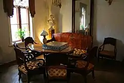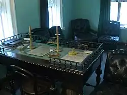Рядом находится кабинет, где Толстой работал над своими произведениями[40]. В центре расположен письменный стол, на котором лежат две ручки, деревянное пресс-папье, линейка, хрустальная чернильница и бронзовые подсвечники[41][42].