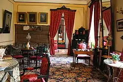 Следующую комнату Лев Толстой называл скучной гостиной: сюда проходили гости после того, как пили чай из большого самовара в главной зале. Гостиная Софьи Толстой украшена коврами, а на стенах висят фотографии семьи писателя в рамках из кожи, работы Репина, изображение дочерей Татьяны и Марии Валентином Серовым и Николаем Ге[37].