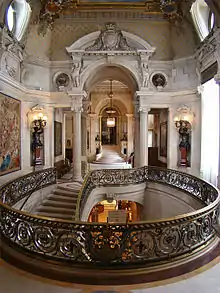 С левой стороны находится большая парадная лестница, ведущая в малые покои. Она представляет собой копию лестницы Пале-Рояля, резиденции Орлеанских герцогов в Париже. Потолок над ней расписан Диогеном Майаром по оригиналу Эли Делоне «Надежда, несущая знамя Франции»[19].