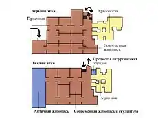 Широкая лестница ведёт вниз. Нижний этаж крепится к верхнему с помощью стальных арок, что освобождает коридоры и залы от архитектурных барьеров. Подземные помещения музея занимает пространство под тремя монастырскими площадями, созданными в рамках архитектурных и градостроительных реформ Монтсеррат между 1929 и 1933 годами. Подвальное помещение фундамента колокольни было также переоборудовано и использовано под выставочный зал.[8]