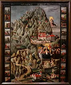 Среди представленных экспонатов выделяются подаренные в 1994 Демократической конвергенцией Каталонии красочные полотна неизвестных авторов XVII столетия с изображением Богоматери и горы Монтсеррат. Живопись выполнена на основе напечатанных в Риме в 1572 гравюр известного римского картографа и издателя XVI века Антонио Лафрери (Antonio Lafreri, 1512—1577). Композиции избавлены от объективного восприятия и визуально рассказывают историю географического и духовного явления Монтсеррата: постижение образа Девы Марии, её почитание в церкви, монастыре, в пути и часовне. Картины показывают паломников, жилища отшельников, расселившихся на склоне горы с её характерными вершинами. Легенда о Монахе-отшельнике Фра Гари (англ. Friar Garí) и чудесах, сделавших его святое изображение известным, написана на полях холста.[25]