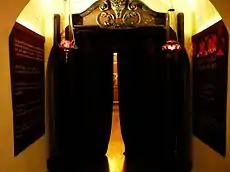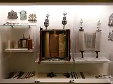 Еврейские культовые предметы иллюстрируют различные религиозные обычаи:[19] Семисвечники — лампы, зажигаемые во время праздника Хануки; Меноры — небольшие коробки, которые содержат Шему — надпись на пергаменте, декларирующая единственность Бога, любовь к нему и верность его заповедям. Евреи прибивали эти коробки к дверным рамам и всегда касались их при выходе и входе в дом; Тфилины — элементы молитвенного облачения, сделанные из кожи кошерных животных, содержащие написанные на пергаменте отрывки из Торы; Хадассы, которые использовались для рассеивания ладана как часть ритуала, отделявшего святое от грешного.