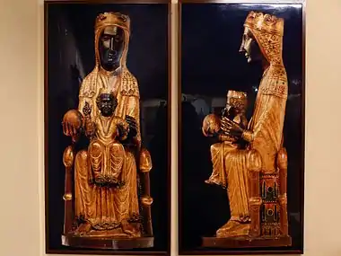 В музее выставлены две фотографии, которые воспроизводят в фас и профиль скульптуру Святой Девы конца XII века, установленную в апсиде монастырской базилики. Скульптура вырезана из тополя, имеет высоту 95 см. Божия матерь изображена сидящей на стуле с младенцем на коленях. В правой руке она держит сферу, которая символизирует вселенную. Младенец Иисус с чертами лица и осанкой взрослого человека поднимает правую руку в благословляющем жесте, левой рукой он держит сосновую шишку. В античной мифологии шишка сосны (пинии) символизировала плодородие, возрождение и бессмертие. Короны на головах Девы Марии и Младенца, а также их одежды золотого цвета. Лица и руки тёмного, почти чёрного, цвета, что и определило название скульптуры. Изначально скульптура была светлой; чёрный цвет с коричневым отливом появился позже как результат химической реакции красок и лака на тепло и дым свечей, которые зажигались в течение столетий у подножия статуи.[22]