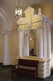 Нижний этаж дворца трактован как цокольный, служащий основанием для второго, большего по высоте. К первоначальному периоду истории дома принадлежит решение вестибюля. Низкие массивные Пилоны, декорированные колоннами, выступающими на две трети своего диаметра, несут арки и крестовые своды. На них покоится пол большого восьмиугольного зала в бельэтаже.