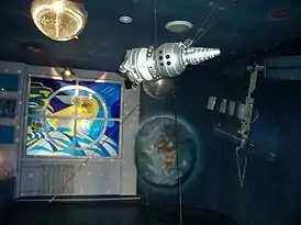 Также можно увидеть витражи, которые рассказывают о выходе Леонова в космос, полномасштабный макет первого спутника Земли «Спутник-1», запущенного в СССР 4 октября 1957 года, миниатюру современного спутника «Ресурс Ф1» (в размере 1:10), теплозащитный костюм и многое другое.
