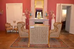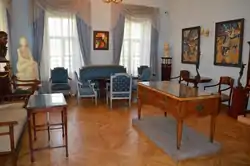 Главной комнатой музейной экспозиции являлась гостиная, в которой были представлены экспонаты усадебных гостиных XVIII—XIX веков. Здесь стоит комплект дивана и двух кресел с вырезанными чёрными лебедями вместо ручек — пример изобретательства крепостных мастеров. Карельская берёза являлась дорогостоящим материалом, поэтому некоторые рабочие делали мебель из обычной берёзы средней полосы России, окрашивая её в чёрный цвет и отделывая эбеновым деревом[2]. Отличительной особенностью работы российских мастеров являлась видимая функциональность. Это было связано с неразвитостью мебельного мастерства в Российской Империи, что также влияло на ценообразование[11]. Также в гостиной расположены неотреставрированные зеркала середины XVII века, комод-бар, сконструированный в начале XIX века, а также бюро, служащее как рабочим местом, так и местом для хранения вещей[2].