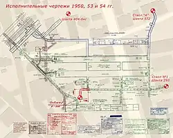 - РДС-1. 29 августа 1949 года (Семипалатинский полигон): заряд 22 кт на башне на высоте 30 м. Под башней были построены три штрека небольшого размера с разным типом крепления из железобетона и металла на глубинах 10, 20 и 30 метров, лучами расходящиеся от эпицентра. От штреков на поверхность вели стволы с небольшими железобетонными оголовками, все на расстоянии 52 м от эпицентра[21]. При взрыве все оголовки провалились, стволы были раздавлены, а штреки обрушились на глубине 10 и 20 метров; для изучения шахты пришлось почти полностью заново отстроить. Все подопытные животные в сооружениях на всех глубинах погибли[22][23]. Скорость распространения светящегося фронта ударной волны в радиусе 50 метров от центра взрыва составляла 14 км/с[24] при давлении фронта около 200 МПа (~2000 атмосфер)[25], что достаточно для разрушения любых самых прочных сооружений. Один из первоначальных проектов строительства полигона в 1946 году предусматривал другой, возможно более адекватный для близкого атомного взрыва вариант эпицентральных сооружений. Предполагалось возвести пять штреков на глубинах 10, 20, 30, 40 и 50 метров с выходом через один ствол на расстоянии 100 метров от центра испытательного поля[26], что могло бы более точно продемонстрировать, на каких расстояниях от эпицентра и глубинах сооружение типа метро устоит от разрушения и спасёт живые существа.