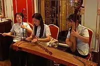 Инструментальное исполнение в традиционной китайской музыке сольное и ансамблевое (небольшие оркестры, играющие на щипковых и смычковых струнных, флейтах, цимбалах, гонгах и барабанах).