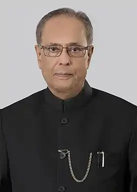 Пранаб Кумар Мук(х)ерджи (бенг. প্রনব কুমার মুখার্জী, англ. Pranab Mukherjee; 11 декабря 1935, дер. Мирати, Бирбхум, Бенгалия, Британская Индия[7] — 31 августа 2020) — индийский государственный деятель, 13-й президент Индии (2012—2017). Ранее занимал посты министра обороны (2004—2006), иностранных дел (2006—2009) и финансов (1982—1984 и 2009—2012).
