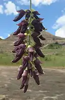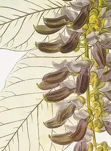 Соцветие — повислая кисть длиной от 15 до 32 см. Цветки длиной от 2,5 до 5 мм, располагаются перпендикулярно оси соцветия, с прицветными листочками длиной около 12,5 мм. Чашечки колокольчатые шелковистые, 7,5—9 мм. Чашелистики белые, бледно-лиловые или фиолетовые. Лодочка длиной 1,5 мм, вёсла 2,5—3,8 см.