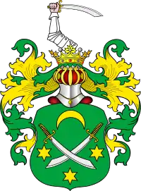 Щит увенчан дворянскими шлемом и короной. Нашлемник: рука в латах с мечом. Намет на щите зелёный, подложенный золотом.