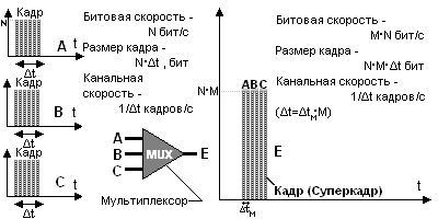 На рисунке: А, В и С — мультиплексируемые каналы с пропускной способностью (шириной) N и длительностью кадра Δt; E — мультиплексированный канал с той же длительностью Δt, но с шириной M*N, один кадр которого (суперкадр) несёт в себе все 3 кадра входных мультиплексируемых сигналов последовательно, каждому каналу отводится часть времени суперкадра — таймслот, длиной ΔtM=Δt/M