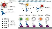 Мультиплексные анализы предназначены для детектирования в биологическом образце различных биомолекул (от 10 до 1000) одного класса (ДНК, РНК или белков). В соответствии с типом детектируемых молекул, анализ базируется на использовании набора нуклеиновых кислот или белков. Например, мультиплексный иммунологический метод основан на применении латексных микрошариков, каждый из которых покрывается определенным типом антител и кодируется определенной комбинацией флуоресцентных квантовых точек. Метод позволяет определить от 10 до 100 биологических маркеров в капле крови пациента в течение нескольких минут.
