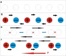 Механизм зарядового упорядочения. Чёрными стрелками показано направление локальной поляризации, красной стрелкой — направление суммарной поляризации