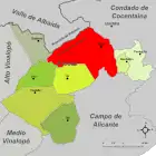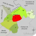 Муниципалитеты Аликанте также объединены в девять комарок: Марина-Альта (33 муниципалитета), Вега-Баха-дель-Сегура (27), Комтат (24), Марина-Баха (18), Виналопо-Миджа (11), Алаканти (10), Ойя-де-Алькой (8), Альто-Виналопо (7) и Бахо-Виналопо (3).