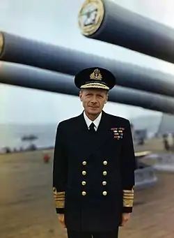 ![]() Сэр Генри Мур на палубе HMS Duke of York | |