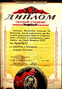 В 1947 году Муратов, находившийся тогда в рядах Советской армии, разработал «Фотоэлектрический протез для слепых с фотоэлементом и преобразователем тока в акустические колебания, отличающийся тем, что, с целью получения пространственного восприятия, протез снабжён оптической системой, проецирующей изображение, лежащее в узком конусе, на фотоэлемент, причем сканирование предметов осуществляется самим слепым»]].[1]