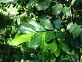 Листья непарноперистые с 2—3 парами листочков; листочки на коротких черешках, обратнояйцевидные, глянцевитые, тёмно-зелёные, голые, длиной до 5 см[6].