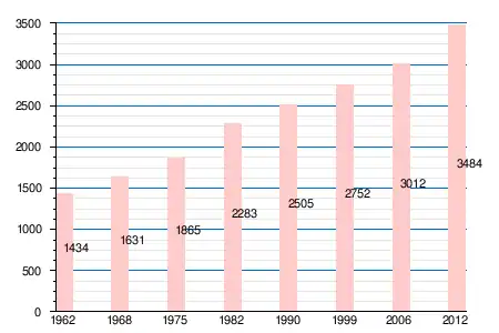 | 1434 | 1631 | 1865 | 2283 | 2505 | 2752 | 3012 | 3085 | 3520 | 3484 |