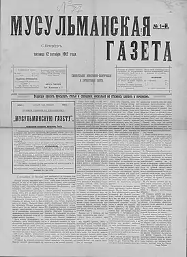 ![]() Первый номер «Мусульманской газеты» от 12 октября (25 октября) 1912 года,хранится в Отделе газет Российской национальной библиотеки | |