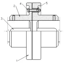 Ведущая и ведомая полумуфты в виде круглых дисков (1), которые своими ступицами (2) установлены на концах валов с использованием шпоночного соединения (3). Оба диска соединены болтами (4). В одном из дисков между болтом и отверстием вложены резиновые втулки (5). Резиновые втулки могут сглаживать вибрации и колебания, которые возникают на приводном валу и в некоторой степени компенсировать динамические нагрузки во время запуска и торможения.