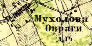 МУХОЛОВО (ОВРАГИ) — деревня удельная при пруде, число дворов — 15, число жителей: 59 м. п., 64 ж. п.[8] (1862 год)