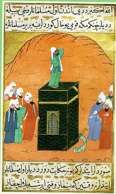 Традиция призыва на молитву (азан) возникла либо до переселения пророка Мухаммеда в Медину (хиджра), либо через два года после переселения. Ритуал азана введен по аналогии с колокольным звоном у христиан и звуком трубы у иудеев. Первым муэдзином был абиссинец Билял ибн Рабах, обладавший голосом необычайной силы, который был слышен по всей Медине[4]. Эту обязанность возложил на него пророк Мухаммад. Помимо него, одним из первых муэдзинов был и Абдуллах ибн Умм Мактум[5].