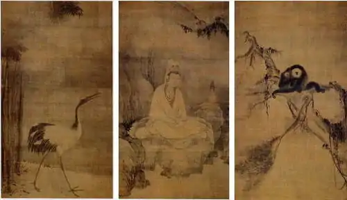 В монастыре Людунсы, возглавляемом Му Ци, возник главный центр чаньской живописи. Монах создавал свои произведения, не выходя за границы основных китайских жанров, таких как «жэнь-у (хуа)», «(живопись/изображения) фигур», пейзаж — «шань-шуй (хуа)» «(живопись/изображения) гор и вод», «хуа-няо хуа», «(живопись/изображения) цветов и птиц». Лучшим творением Му Ци в жанре «жэнь-у», традиционно объединявшем в себе живопись на религиозные темы, считается триптих «Гуань-инь юань хэ» («Гуань-инь, обезьяна и журавль», коллекция монастыря Дайтокудзи, Токио), образованный тремя почти одинаковыми по формату (ок.170 х 100 см.) вертикальными свитками. Эта картина, как и другие имели глубокое влияние на последующее развитие живописи тушью в самой Японии.