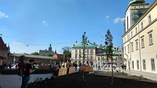 Застройка площади: вдоль западной части простираются стены костела и монастыря бернардинцев с Глинянскими воротами, вдоль восточной части — костёл клариссинок с бывшим келейным корпусом. Ныне в костёле расположен Музей сакральной барочной скульптуры Пинзеля, а в келейном корпусе — учебное заведение. В юго-восточной части площади расположен миниатюрный сквер и фонтан «Мальчик».