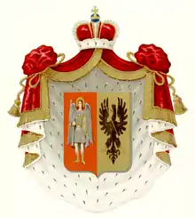 - Щит разделен перпендикулярно на две части. В правой части герб Великого Княжества Киевского (поле червленое, а не лазурное); в червлёном поле Ангел в одежде серебряной, держащий в правой руке меч, а в левой золотой щит. В левой части герб Великого Княжества Черниговского: в золотом поле чёрный одноглавый орел с распростёртыми крыльями и с золотой короной на голове, держащий в левой лапе большой золотой крест. Щит покрыт княжеской мантией и российско-княжеской шапкой.
