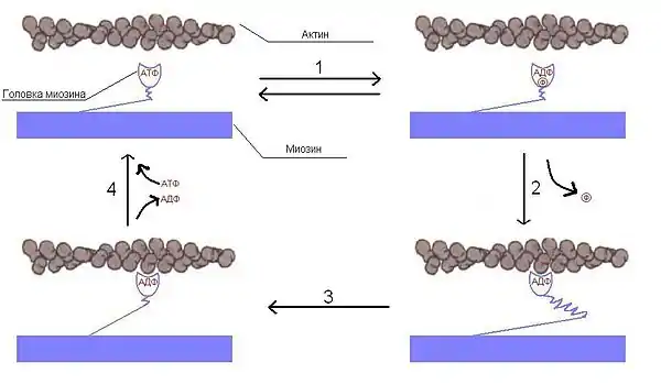 Головки миозина расщепляют АТФ и за счет высвобождающейся энергии меняют конформацию, скользя по актиновым филаментам. Цикл можно разделить на 4 стадии: