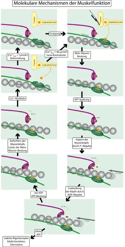 Для того, чтобы контролировать сокращение, к актиновому филаменту прикрепляется белок тропомиозин и комплекс из трёх белков — тропонин (субъединицы этого комплекса называются тропонинами T,I и C). Тропонин C — близкий гомолог другого белка, кальмодулина. Через каждые семь субъединиц актина расположен только один тропониновый комплекс. Связь актина с тропонином I перемещает тропомиозин в положение, мешающее связи миозина с актином. Тропонин C связывается с четырьмя ионами Ca2+ и ослабляет действие тропонина I на актин, и тропомиозин занимает положение, не препятствующее связи актина с миозином. Источником энергии для сокращения мышечных волокон служит АТФ. При связывании тропонина с ионами кальция активируются каталитические центры для расщепления АТФ на головках миозина. За счет ферментативной активности головок миозина гидролизуется АТФ, расположенный на головке миозина, что обеспечивает энергией изменение конформации головок и скольжение нитей. Освобождающиеся при гидролизе АТФ молекула АДФ и неорганический фосфат используются для последующего ресинтеза АТФ. К миозиновой головке присоединяется новая молекула АТФ. При этом происходит разъединение поперечного мостика с нитью актина. Повторное прикрепление и отсоединение мостиков продолжается до тех пор, пока концентрация кальция внутри миофибрилл не снизится до подпороговой величины. Тогда мышечные волокна начинают расслабляться.