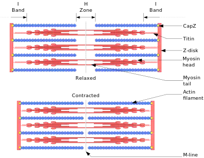 | Титин | Большой гибкий белок, образующий цепь для связывания миозина с Z-диском. | ||