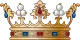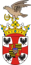 Щит увенчан маркизской короной. Над короной смотрящий вправо ястреб, с привязанными к лапе бубенчиками, держит такую же как в малом щитке подкову.