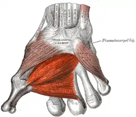 - косая головка (лат. caput obliquum) начинается от лучистой связки запястья, головчатой кости и ладонной поверхности II и III пястных костей