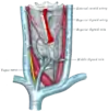 Верхнее брюшко (лат. venter superior) | Нижний край тела подъязычной кости (лат. margo inferior corpi ossis hyoidei) | Сухожилие срастается с фасциальным влагалищем сосудисто-нервного пучка шеи | Верхний корешок шейной петли CI—CIII (лат. radix superior ansae cervicalis CI—CIII) | Тянет подъязычную кость книзу и кнаружи; оттягивается влагалище сосудисто-нервного пучка шеи, расширяя просвет внутренней яремной вены | ||