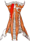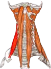 Остистый отросток осевого позвонка (лат. processus spinosus CII) | Латеральный отрезок нижней выйной линии затылочной кости (лат. linea nuchae inferior ossis occipitalis) | Глубокая шейная артерия (лат. a. cervicalis profunda) | Шейные, грудные и поясничные ветви спиномозговых нервов (лат. nn. cervicalis, thoracici et lumbales) | Движение головы кзади; наклон головы назад и в стороны; вращение головы | |