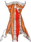 - Предпозвоночные мышцы — длинная мышца шеи (лат. m. longus colli), длинная мышца головы (лат. m. longus capitis), передняя прямая мышца головы (лат. m. rectus capitis anterior), латеральная прямая мышца головы (лат. m. rectus capitis lateralis).