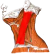 Вертикальная часть (лат. pars recta) | Тела и поперечные отростки V шейного до III грудного позвонков (лат. corpus et processus transversus CI—TIII) | Передняя поверхность тел II—III шейных позвонков (лат. facies anterior corpi CII—III) и передний бугорок атланта (лат. tuberculum anteris atlantis) | Позвоночная, восходящая и глубокая шейная артерии (лат. aa. vertebralis, cervicalis ascendens et profunda) | Шейные нервы CIII—CVIII (лат. nn. cervicalis CIII—CVIII) | Наклоняет шейный отдел позвоночного столба вперёд и в сторону | |
