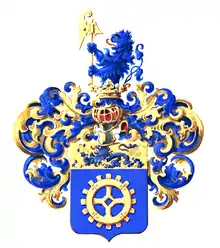 В лазуревом щите золотое зубчатое колесо водяной мельницы с четырьмя спицами. В золотой главе щита стоящий на трех лапах, четвёртая поднята, лазуревый лев, обращенный вправо, с червлеными глазами и языком.