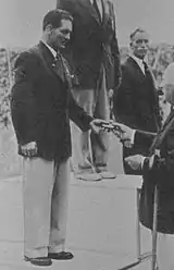 ![]() Адольф Мюллер (на заднем плане) и Ивар Шёлин на церемонии награждения. Лондон, 1948 | |