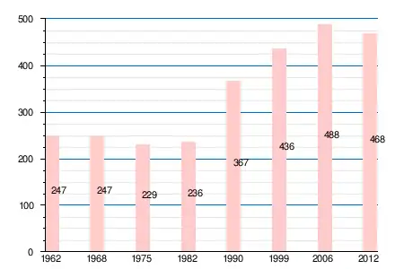 | 1962 | 1968 | 1975 | 1982 | 1990 | 1999 | 2005 | 2006 | 2008 | 2010 | 2011 | 2012 |