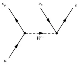 Распад мюона происходит под действием слабого взаимодействия: мюон распадается на мюонное нейтрино и W--бозон (виртуальный), что в свою очередь быстро распадается на электрон и электронное антинейтрино. Такой распад является одной из форм бета-распада[14]. Иногда (примерно в одном проценте случаев) вместе с этими частицами образуется фотон, а в одном случае из 10000 — ещё один электрон и позитрон[12].